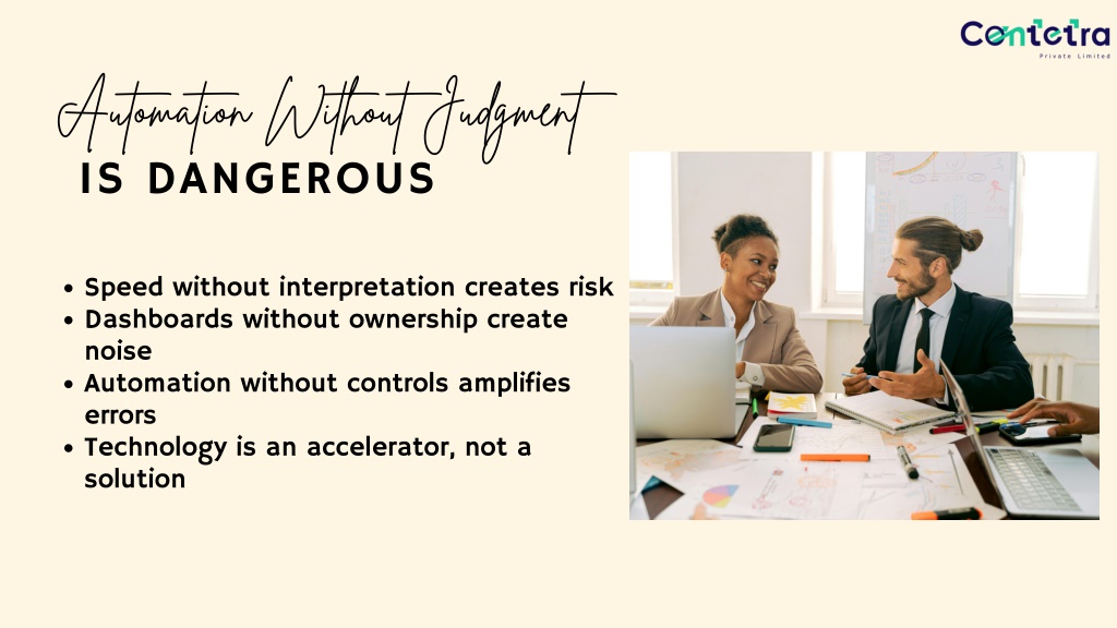 Automation Without Judgment IS DANGEROUS Speed without interpretation creates risk Dashboards without ownership create noise Automation without controls amplifies errors Technology is an accelerator, not a solution