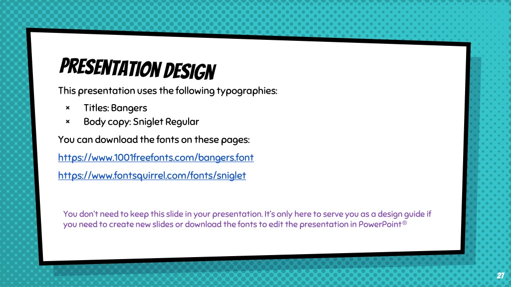 26. Presentation design This presentation uses the following typographies: • Titles: Bangers • Body copy: Sniglet Regular You can download the fonts on these pages: https://www.1001freefonts.com/bangers.font https://www.fontsquirrel.com/fonts/sniglet You don’t need to keep this slide in your presentation. It’s only here to serve you as a design guide if you need to create new slides or download the fonts to edit the presentation in PowerPoint®