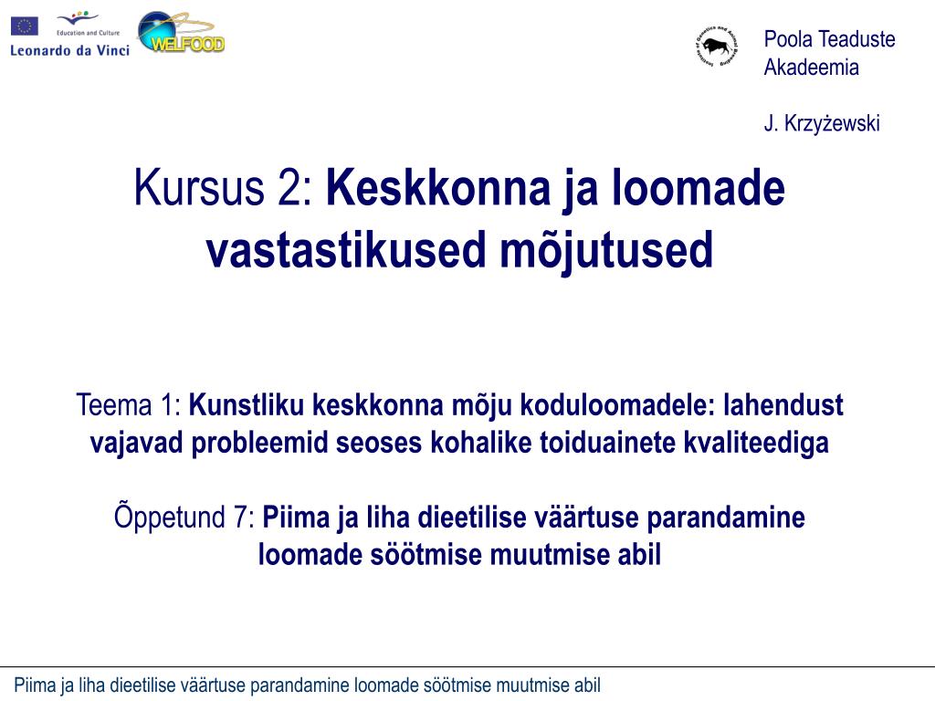 Poola Teaduste Akadeemia J. Krzyżewski Kursus 2: Keskkonna ja loomade vastastikused mõjutusedTeema 1: Kunstliku keskkonna mõju koduloomadele: lahendust vajavad probleemid seoses kohalike toiduainete kvaliteediga Õppetund 7: Piima ja liha dieetilise väärtuse parandamine loomade söötmise muutmise abil