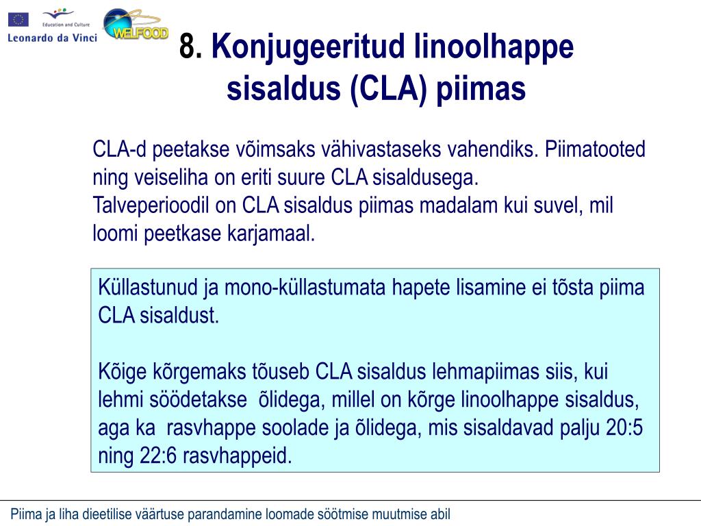 8. Konjugeeritud linoolhappe sisaldus (CLA) piimas CLA-d peetakse võimsaks vähivastaseks vahendiks. Piimatooted ning veiseliha on eriti suure CLA sisaldusega. Talveperioodil on CLA sisaldus piimas madalam kui suvel, mil loomi peetkase karjamaal. Küllastunud ja mono-küllastumata hapete lisamine ei tõsta piima CLA sisaldust. Kõige kõrgemaks tõuseb CLA sisaldus lehmapiimas siis, kui lehmi söödetakse õlidega, millel on kõrge linoolhappe sisaldus, aga ka rasvhappe soolade ja õlidega, mis sisaldavad palju 20:5 ning 22:6 rasvhappeid.