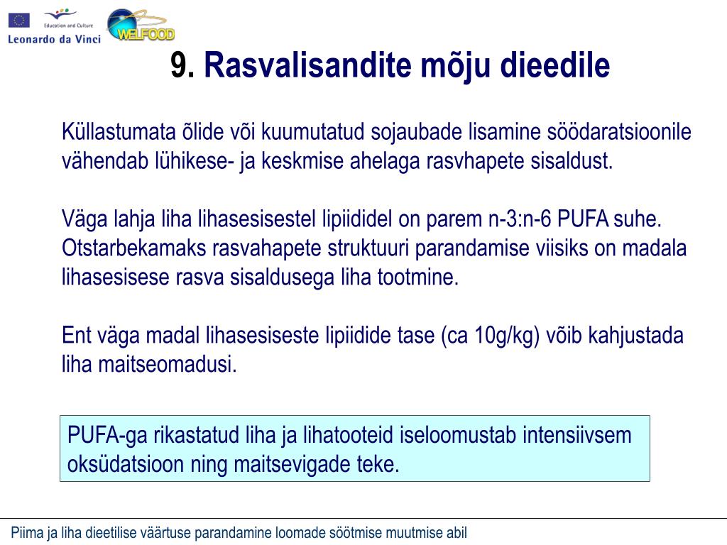 9. Rasvalisandite mõju dieedile Küllastumata õlide või kuumutatud sojaubade lisamine söödaratsioonile vähendab lühikese- ja keskmise ahelaga rasvhapete sisaldust. Väga lahja liha lihasesisestel lipiididel on parem n-3:n-6 PUFA suhe. Otstarbekamaks rasvahapete struktuuri parandamise viisiks on madala lihasesisese rasva sisaldusega liha tootmine. Ent väga madal lihasesiseste lipiidide tase (ca 10g/kg) võib kahjustada liha maitseomadusi. PUFA-ga rikastatud liha ja lihatooteid iseloomustab intensiivsem oksüdatsioon ning maitsevigade teke.