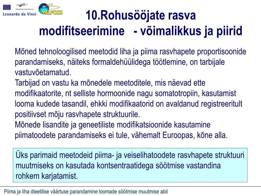Rohusööjate rasva • modifitseerimine - võimalikkus ja piirid Mõned tehnoloogilised meetodid liha ja piima rasvhapete proportisoonide parandamiseks, näiteks formaldehüülidega töötlemine, on tarbijale vastuvõetamatud. Tarbijad on vastu ka mõnedele meetoditele, mis näevad ette modifikaatorite, ntselliste hormoonidenagu somatotropiin, kasutamist looma kudede tasandil, ehkki modifikaatorid on avaldanud registreeritult positiivset mõju rasvhapete struktuurile. Mõnede lisandite ja geneetiliste modifikatsioonide kasutamine piimatoodete parandamiseks ei tule, vähemalt Euroopas, kõne alla. Üks parimaid meetodeid piima- ja veiselihatoodete rasvhapete struktuuri muutmiseks on kasutada kontsentraatidega söötmise vastandina rohkem karjatamist.