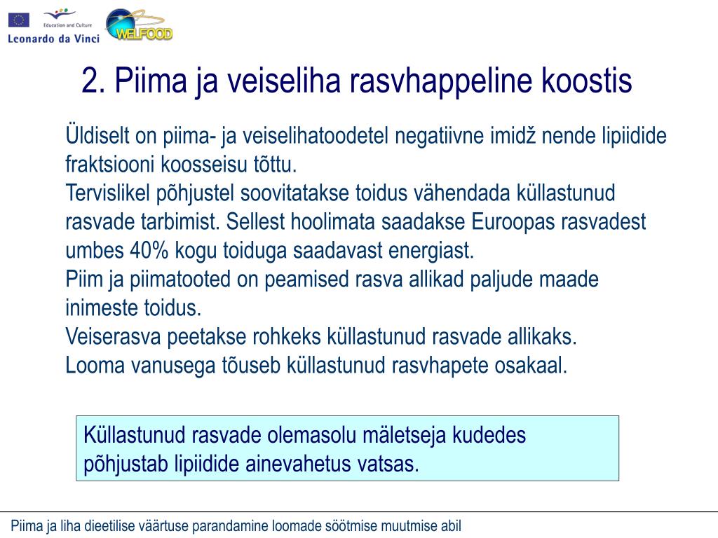 2. Piima ja veiseliharasvhappeline koostis Üldiselt on piima- ja veiselihatoodetelnegatiivne imidž nende lipiidide fraktsiooni koosseisu tõttu. Tervislikel põhjustel soovitatakse toidus vähendada küllastunud rasvade tarbimist. Sellest hoolimata saadakse Euroopas rasvadestumbes 40% kogu toiduga saadavast energiast. Piim ja piimatooted on peamised rasva allikad paljude maade inimeste toidus. Veiserasva peetakse rohkeks küllastunud rasvade allikaks. Looma vanusega tõuseb küllastunud rasvhapete osakaal. Küllastunud rasvade olemasolu mäletseja kudedes põhjustab lipiidide ainevahetus vatsas.
