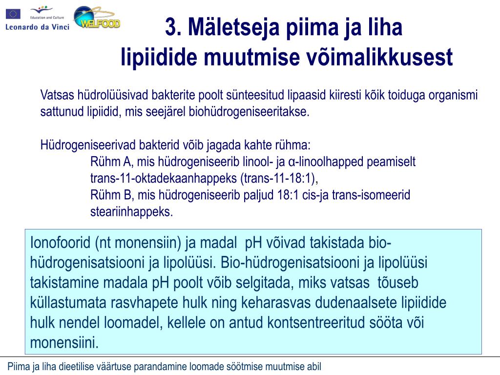 3. Mäletseja piima ja liha lipiidide muutmise võimalikkusest Vatsas hüdrolüüsivad bakterite poolt sünteesitud lipaasid kiiresti kõik toiduga organismi sattunud lipiidid, mis seejärel biohüdrogeniseeritakse. Hüdrogeniseerivad bakterid võib jagada kahte rühma: Rühm A, mis hüdrogeniseerib linool- ja α-linoolhapped peamiselt trans-11-oktadekaanhappeks (trans-11-18:1), Rühm B, mis hüdrogeniseerib paljud 18:1 cis-ja trans-isomeerid steariinhappeks. Ionofoorid (ntmonensiin)ja madal pH võivad takistada bio-hüdrogenisatsiooni ja lipolüüsi. Bio-hüdrogenisatsiooni ja lipolüüsi takistamine madala pH poolt võib selgitada, miks vatsas tõuseb küllastumata rasvhapete hulk ning keharasvas dudenaalsete lipiidide hulk nendel loomadel, kellele on antud kontsentreeritud sööta või monensiini.
