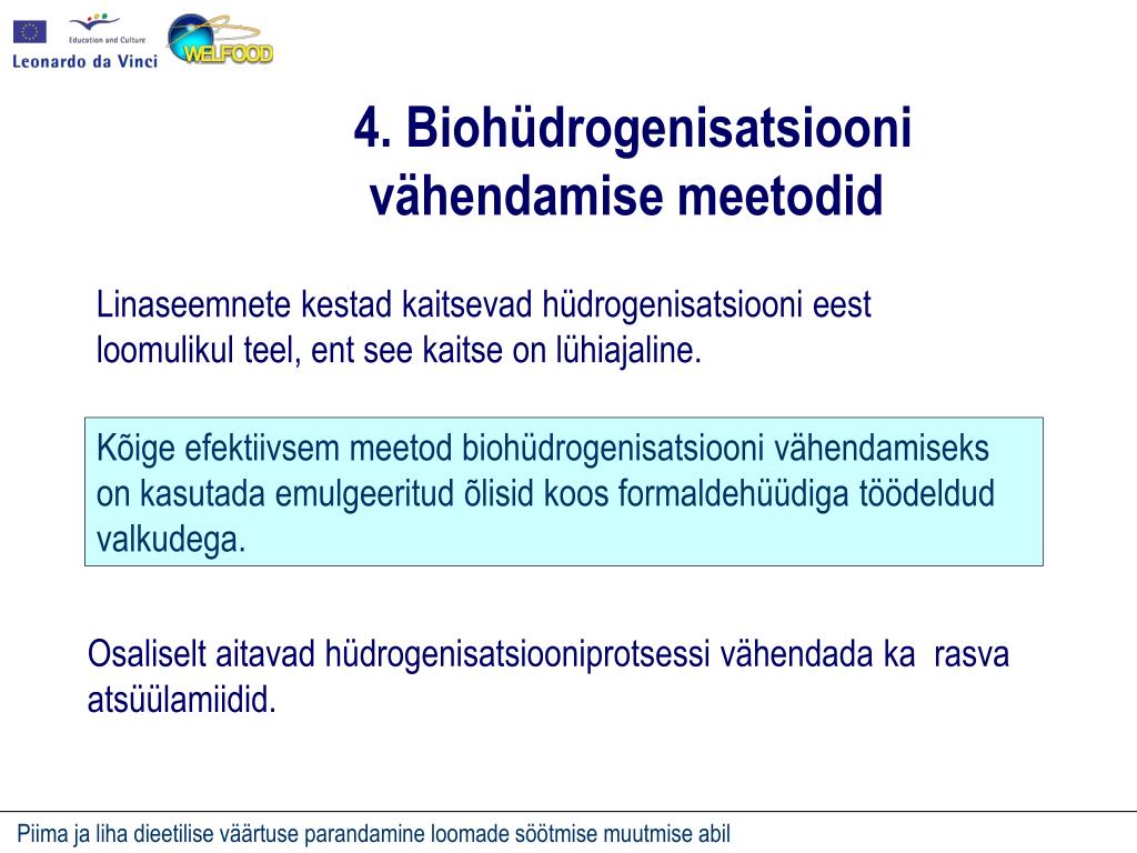 4. Biohüdrogenisatsiooni vähendamise meetodid Linaseemnete kestadkaitsevad hüdrogenisatsiooni eest loomulikul teel, ent see kaitse on lühiajaline. Kõige efektiivsem meetod biohüdrogenisatsiooni vähendamiseks on kasutada emulgeeritud õlisid koos formaldehüüdiga töödeldud valkudega. Osaliselt aitavad hüdrogenisatsiooniprotsessi vähendada ka rasva atsüülamiidid.
