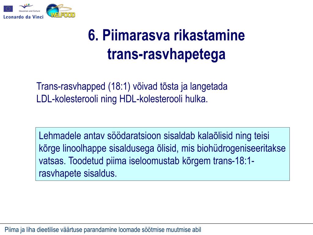 6. Piimarasva rikastamine trans-rasvhapetega Trans-rasvhapped (18:1) võivad tõsta ja langetada LDL-kolesterooli ning HDL-kolesterooli hulka. Lehmadele antav söödaratsioon sisaldab kalaõlisid ning teisi kõrge linoolhappe sisaldusega õlisid, mis biohüdrogeniseeritakse vatsas. Toodetud piima iseloomustab kõrgem trans-18:1-rasvhapete sisaldus.