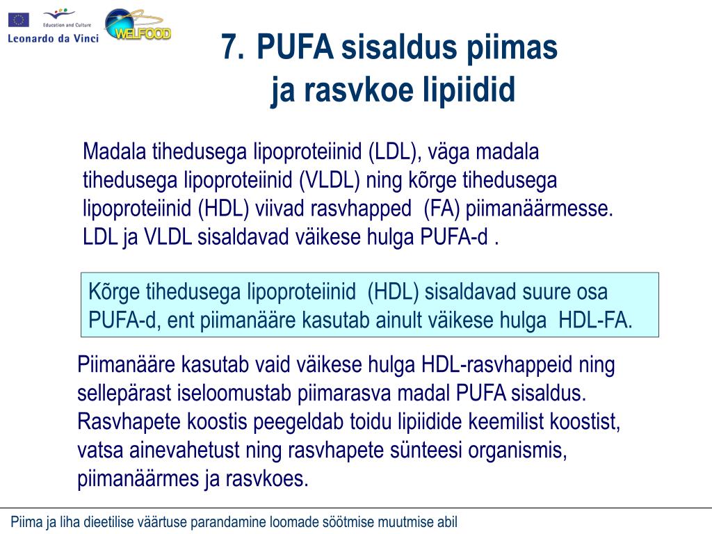 PUFAsisaldus piimas • ja rasvkoe lipiidid Madala tihedusega lipoproteiinid (LDL), väga madala tihedusega lipoproteiinid (VLDL) ning kõrge tihedusega lipoproteiinid (HDL) viivad rasvhapped (FA) piimanäärmesse. LDL ja VLDL sisaldavad väikese hulga PUFA-d. Kõrge tihedusega lipoproteiinid (HDL) sisaldavad suure osa PUFA-d, ent piimanääre kasutab ainult väikese hulga HDL-FA. Piimanääre kasutab vaid väikese hulga HDL-rasvhappeid ning sellepärast iseloomustab piimarasva madal PUFA sisaldus. Rasvhapete koostis peegeldab toidu lipiidide keemilist koostist, vatsa ainevahetust ning rasvhapete sünteesi organismis, piimanäärmes ja rasvkoes.