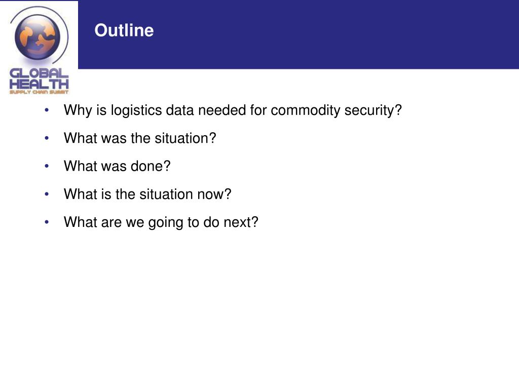Outline Why is logistics data needed for commodity security? What was the situation? What was done? What is the situation now? What are we going to do next?