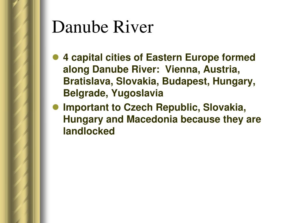 Danube River • 4 capital cities of Eastern Europe formed along Danube River: Vienna, Austria, Bratislava, Slovakia, Budapest, Hungary, Belgrade, Yugoslavia • Important to Czech Republic, Slovakia, Hungary and Macedonia because they are landlocked