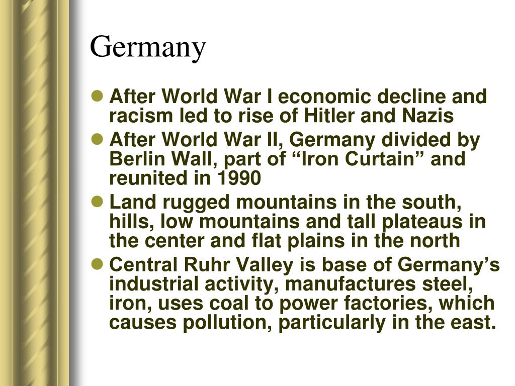 Germany • After World War I economic decline and racism led to rise of Hitler and Nazis • After World War II, Germany divided by Berlin Wall, part of “Iron Curtain” and reunited in 1990 • Land rugged mountains in the south, hills, low mountains and tall plateaus in the center and flat plains in the north • Central Ruhr Valley is base of Germany’s industrial activity, manufactures steel, iron, uses coal to power factories, which causes pollution, particularly in the east.