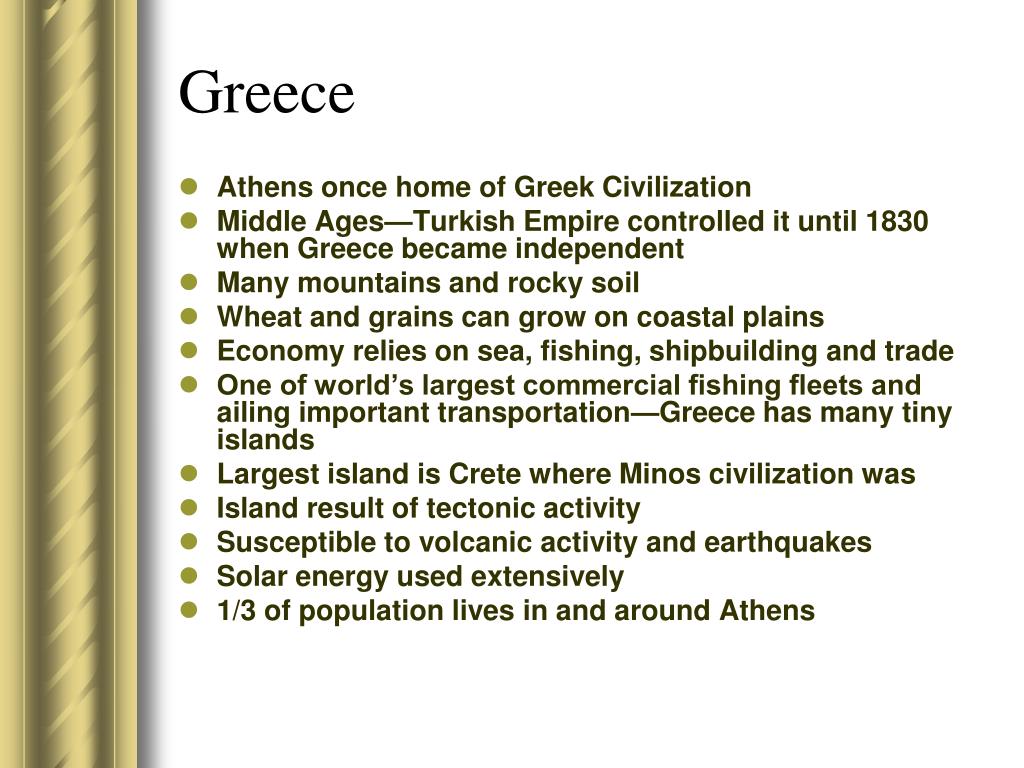 Greece • Athens once home of Greek Civilization • Middle Ages—Turkish Empire controlled it until 1830 when Greece became independent • Many mountains and rocky soil • Wheat and grains can grow on coastal plains • Economy relies on sea, fishing, shipbuilding and trade • One of world’s largest commercial fishing fleets and ailing important transportation—Greece has many tiny islands • Largest island is Crete where Minos civilization was • Island result of tectonic activity • Susceptible to volcanic activity and earthquakes • Solar energy used extensively • 1/3 of population lives in and around Athens