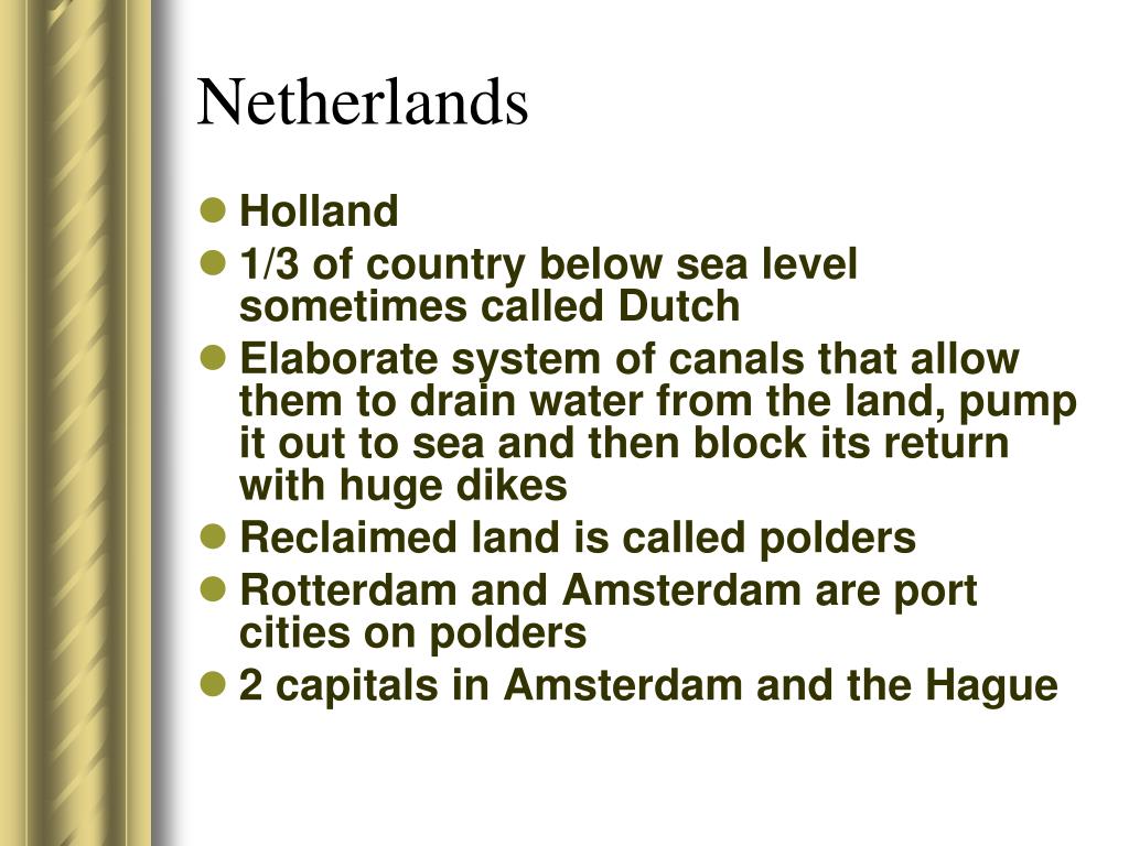 Netherlands • Holland • 1/3 of country below sea level sometimes called Dutch • Elaborate system of canals that allow them to drain water from the land, pump it out to sea and then block its return with huge dikes • Reclaimed land is called polders • Rotterdam and Amsterdam are port cities on polders • 2 capitals in Amsterdam and the Hague