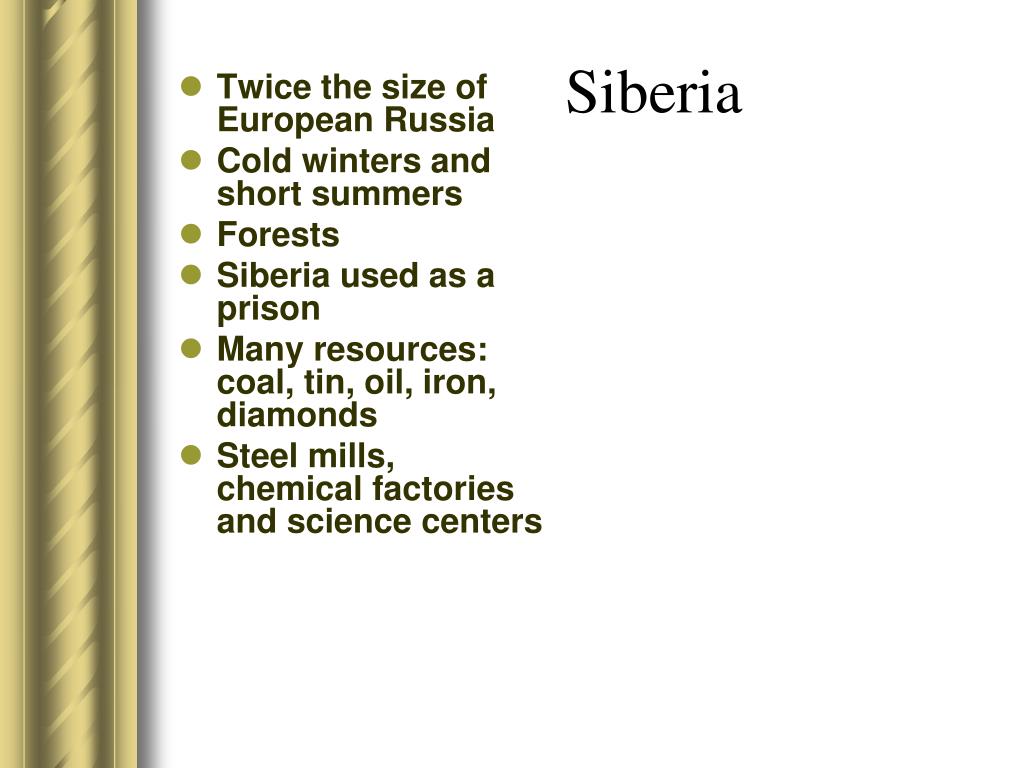 Siberia • Twice the size of European Russia • Cold winters and short summers • Forests • Siberia used as a prison • Many resources: coal, tin, oil, iron, diamonds • Steel mills, chemical factories and science centers