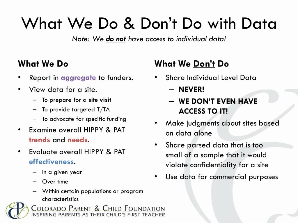 Why We Collect Data • Demonstrate Program Effectiveness • Monitor Program Fidelity • Contribute to Broader Evidence-Base of HIPPY & PAT • Continuous Quality Improvement • Accountability to Existing Funders • Make the Case for New, Additional, or Continued Financial Support
