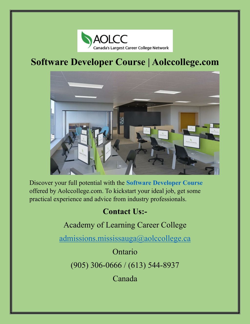 1. Software Developer Course | Aolccollege.com Discover your full potential with the Software Developer Course offered by Aolccollege.com. To kickstart your ideal job, get some practical experience and advice from industry professionals. Contact Us:- Academy of Learning Career College admissions.mississauga@aolccollege.ca Ontario (905) 306-0666 / (613) 544-8937 Canada