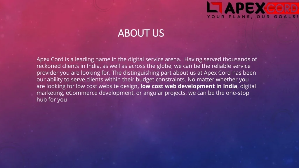 ABOUT US Apex Cord is a leading name in the digital service arena. Having served thousands of reckoned clients in India, as well as across the globe, we can be the reliable service provider you are looking for. The distinguishing part about us at Apex Cord has been our ability to serve clients within their budget constraints. No matter whether you are looking for low cost website design,low cost web development in India, digital marketing, eCommerce development, or angular projects, we can be the one-stop hub for you