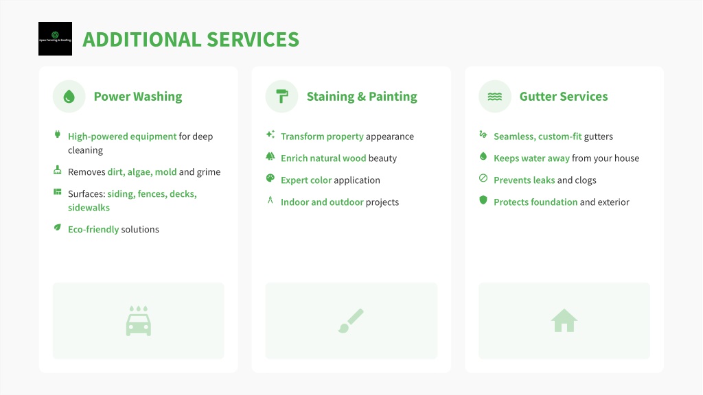 ADDITIONAL SERVICES Power Washing Staining & Painting Gutter Services High-powered equipment for deep cleaning Transform property appearance Seamless, custom-fit gutters Enrich natural wood beauty Keeps water away from your house Removes dirt, algae, mold and grime Expert color application Prevents leaks and clogs Surfaces: siding, fences, decks, sidewalks Indoor and outdoor projects Protects foundation and exterior Eco-friendly solutions
