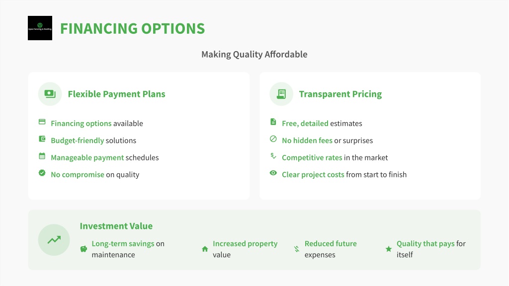 FINANCING OPTIONS Making Quality Affordable Flexible Payment Plans Transparent Pricing Financing options available Free, detailed estimates Budget-friendly solutions No hidden fees or surprises Manageable payment schedules Competitive rates in the market No compromise on quality Clear project costs from start to finish Investment Value Long-term savings on maintenance Increased property value Reduced future expenses Quality that pays for itself