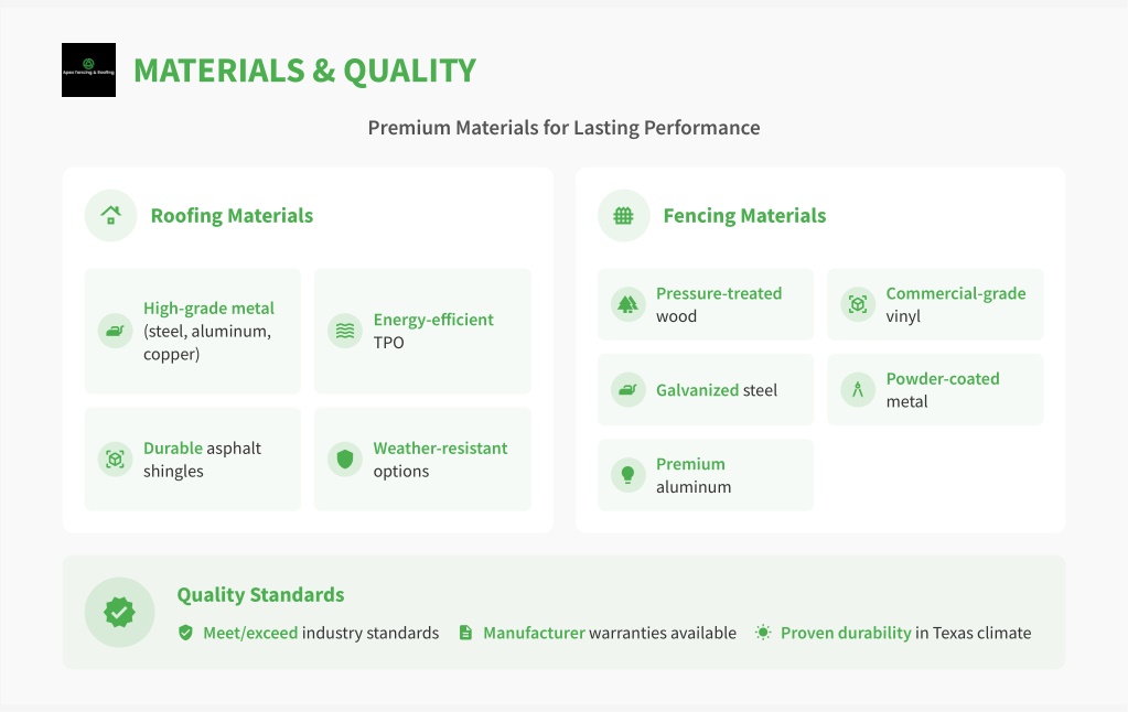 MATERIALS & QUALITY Premium Materials for Lasting Performance Roofing Materials Fencing Materials Pressure-treated wood Commercial-grade vinyl High-grade metal (steel, aluminum, copper) Energy-efficient TPO Powder-coated metal Galvanized steel Durable asphalt shingles Weather-resistant options Premium aluminum Quality Standards Meet/exceed industry standards Manufacturer warranties available Proven durability in Texas climate