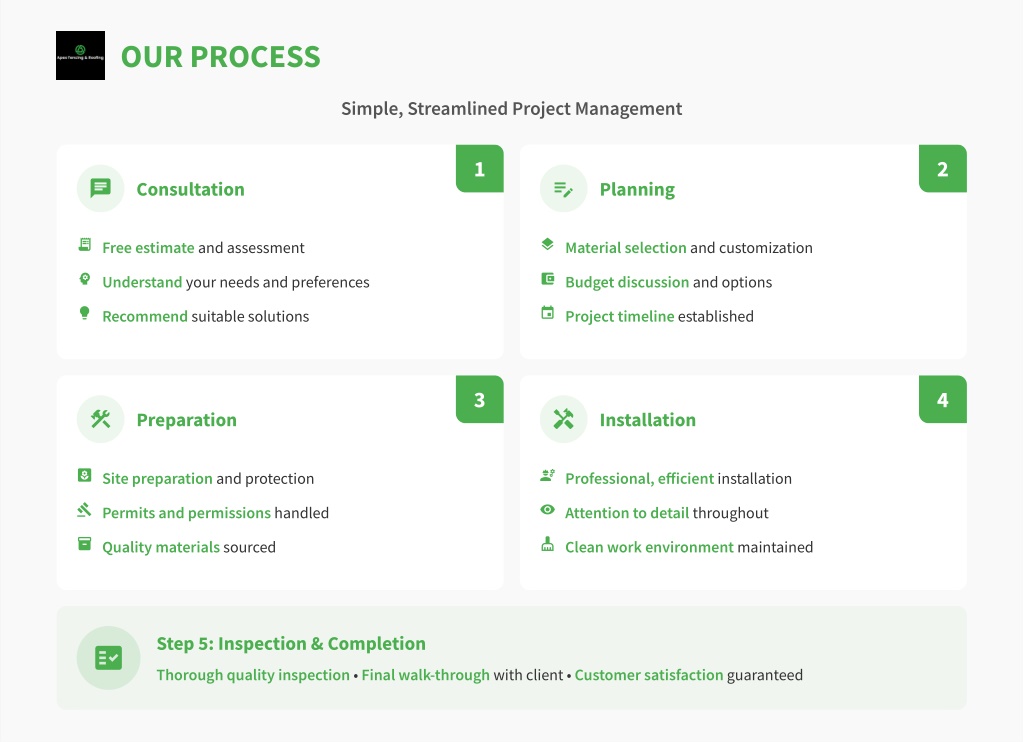 OUR PROCESS Simple, Streamlined Project Management 1 2 Consultation Planning Free estimate and assessment Material selection and customization Understand your needs and preferences Budget discussion and options Recommend suitable solutions Project timeline established 3 4 Preparation Installation Site preparation and protection Professional, efficient installation Permits and permissions handled Attention to detail throughout Quality materials sourced Clean work environment maintained Step 5: Inspection & Completion Thorough quality inspection • Final walk-through with client • Customer satisfaction guaranteed