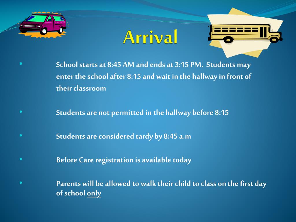 Arrival School starts at 8:45 AM and ends at 3:15 PM. Students may enter the school after 8:15 and wait in the hallway in front of their classroom Students are not permitted in the hallway before 8:15 Students are considered tardy by 8:45 a.m Before Care registration is available today Parents will be allowed to walk their child to class on the first day of school only