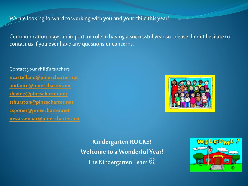 We are looking forward to working with you and your child this year! Communication plays an important role in having a successful year so please do not hesitate to contact us if you ever have any questions or concerns. Contact your child’s teacher: ncastellano@pinescharter.net ainfante@pinescharter.net tlevine@pinescharter.net tthurston@pinescharter.net csponer@pinescharter.net mwassenaar@pinescharter.net Kindergarten ROCKS! Welcome to a Wonderful Year! The Kindergarten Team