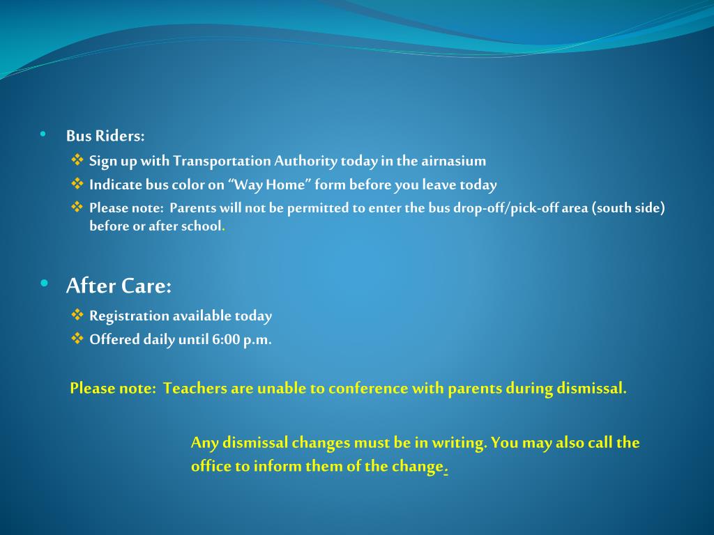 Bus Riders: Sign up with Transportation Authority today in the airnasium Indicate bus color on “Way Home” form before you leave today Please note: Parents will not be permitted to enter the bus drop-off/pick-off area (south side) before or after school. After Care: Registration available today Offered daily until 6:00 p.m. Please note: Teachers are unable to conference with parents during dismissal. Any dismissal changes must be in writing. You may also call the office to inform them of the change.