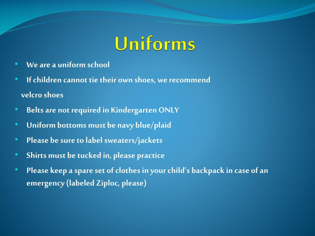 Uniforms We are a uniform school If children cannot tie their own shoes, we recommend velcro shoes Belts are not required in Kindergarten ONLY Uniform bottoms must be navy blue/plaid Please be sure to label sweaters/jackets Shirts must be tucked in, please practice Please keep a spare set of clothes in your child’s backpack in case of an emergency (labeled Ziploc, please)