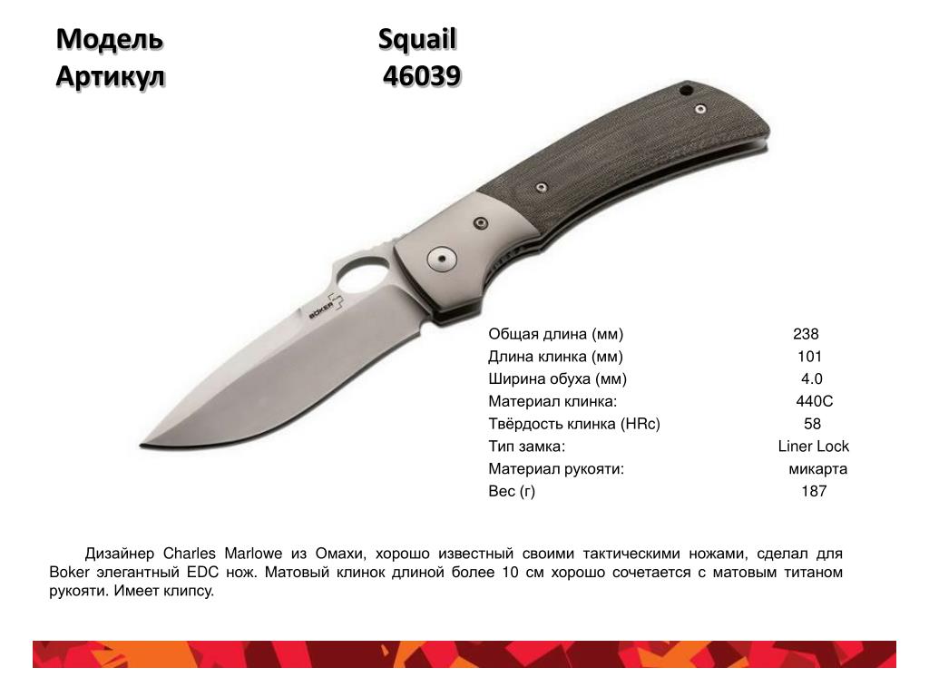 Модель SquailАртикул 46039 Общая длина (мм)238 Длина клинка (мм) 101 Ширина обуха (мм) 4.0 Материал клинка: 440С Твёрдость клинка (HRc) 58 Типзамка: Liner Lock Материал рукояти: микарта Вес (г) 187 Дизайнер Charles Marlowe из Омахи, хорошо известный своими тактическими ножами, сделал для Boker элегантный EDC нож. Матовый клинок длиной более 10 см хорошо сочетается с матовым титаном рукояти. Имеет клипсу.