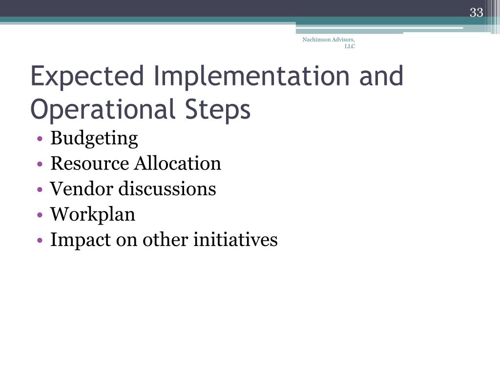 Nachimson Advisors, LLC Expected Implementation and Operational Steps • Budgeting • Resource Allocation • Vendor discussions • Workplan • Impact on other initiatives