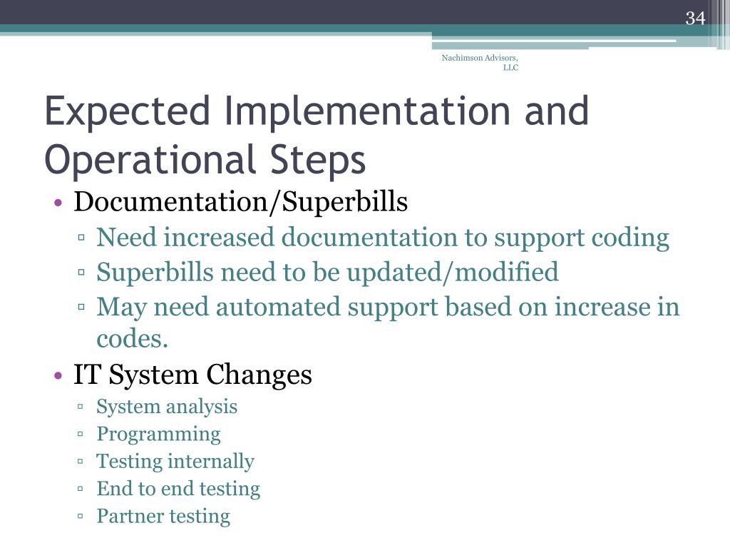 Nachimson Advisors, LLC Expected Implementation and Operational Steps • Documentation/Superbills • Need increased documentation to support coding • Superbills need to be updated/modified • May need automated support based on increase in codes. • IT System Changes • System analysis • Programming • Testing internally • End to end testing • Partner testing