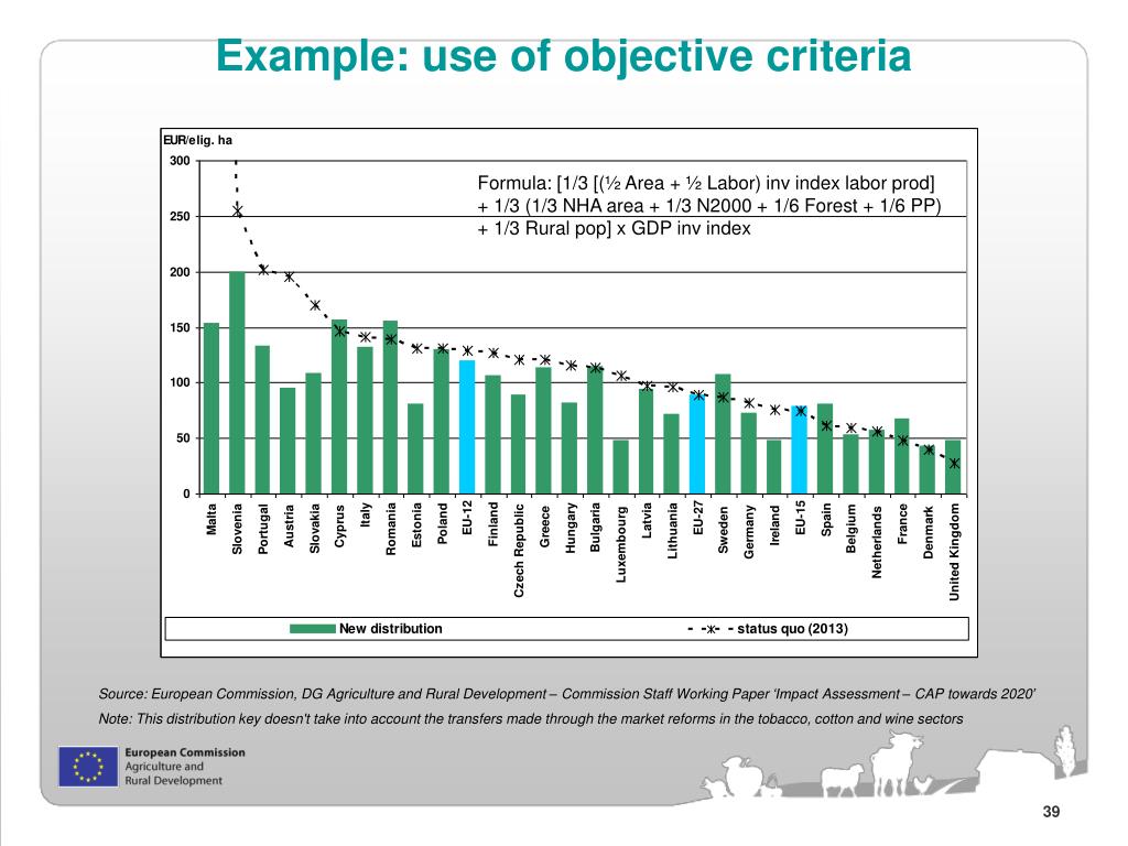 Example: use of objective criteria Formula: [1/3 [(½ Area + ½ Labor) inv index labor prod] + 1/3 (1/3 NHA area + 1/3 N2000 + 1/6 Forest + 1/6 PP) + 1/3 Rural pop] x GDP inv index Source: European Commission, DG Agriculture and Rural Development – Commission Staff Working Paper ‘Impact Assessment – CAP towards 2020’ Note: This distribution key doesn't take into account the transfers made through the market reforms in the tobacco, cotton and wine sectors