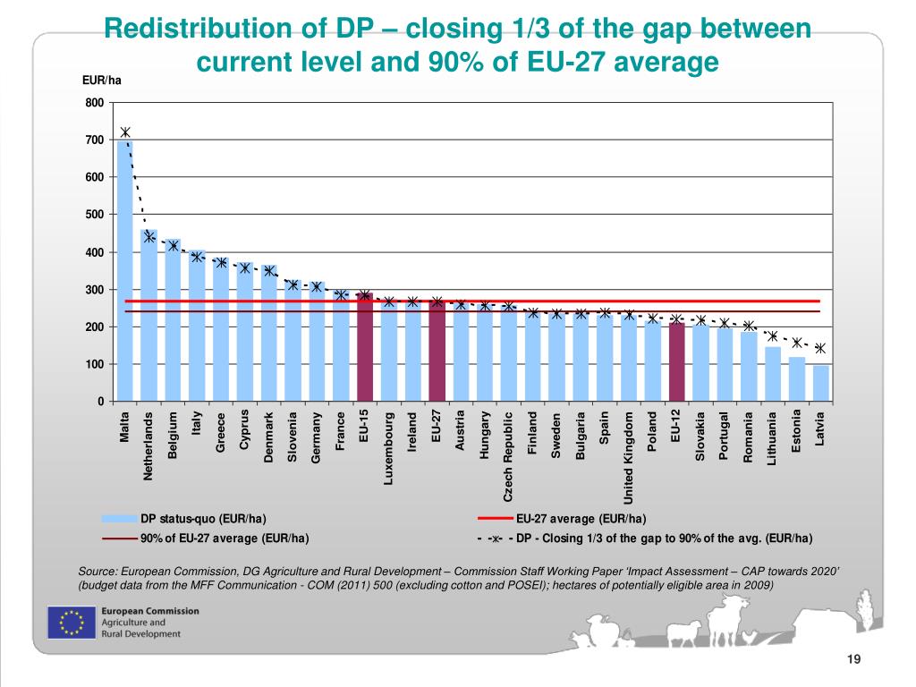 Redistribution of DP – closing 1/3 of the gap between current level and 90% of EU-27 average Source: European Commission, DG Agriculture and Rural Development – Commission Staff Working Paper ‘Impact Assessment – CAP towards 2020’ (budget data from the MFF Communication - COM (2011) 500 (excluding cotton and POSEI); hectares of potentially eligible area in 2009)