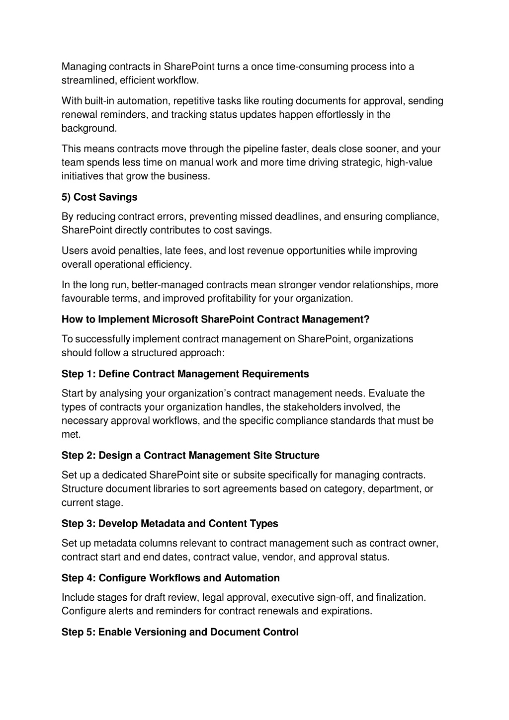 5. ManagingcontractsinSharePointturnsaoncetime-consumingprocessintoa streamlined,efficientworkflow. Withbuilt-inautomation,repetitivetaskslikeroutingdocumentsforapproval,sending renewalreminders,andtrackingstatusupdateshappeneffortlesslyinthebackground. Thismeanscontractsmovethroughthepipelinefaster,dealsclosesooner,andyour teamspendslesstimeonmanual workandmoretimedrivingstrategic,high-value initiativesthatgrowthe business. 5)Cost Savings Byreducingcontracterrors,preventingmisseddeadlines,andensuringcompliance, SharePointdirectlycontributestocostsavings. Usersavoidpenalties,latefees,andlostrevenueopportunitieswhileimproving overalloperationalefficiency. Inthelongrun,better-managedcontractsmeanstrongervendorrelationships, more favourableterms,andimprovedprofitabilityforyourorganization. HowtoImplementMicrosoftSharePointContractManagement? TosuccessfullyimplementcontractmanagementonSharePoint,organizations shouldfollowastructuredapproach: Step1:DefineContractManagementRequirements Startbyanalysingyourorganization’scontractmanagementneeds.Evaluate the typesofcontractsyourorganizationhandles,thestakeholdersinvolved, the necessaryapprovalworkflows,andthespecificcompliancestandardsthatmustbe met. Step2:DesignaContractManagement SiteStructure SetupadedicatedSharePointsiteorsubsitespecificallyformanagingcontracts. Structuredocumentlibrariestosortagreementsbasedoncategory,department, or currentstage. Step3:DevelopMetadataandContentTypes Setupmetadatacolumnsrelevanttocontractmanagementsuchascontractowner, contractstartandenddates,contractvalue,vendor,andapprovalstatus. Step 4:ConfigureWorkflows andAutomation Includestagesfordraftreview,legalapproval,executivesign-off,andfinalization. Configurealertsandremindersforcontractrenewalsandexpirations. Step5:EnableVersioningandDocumentControl