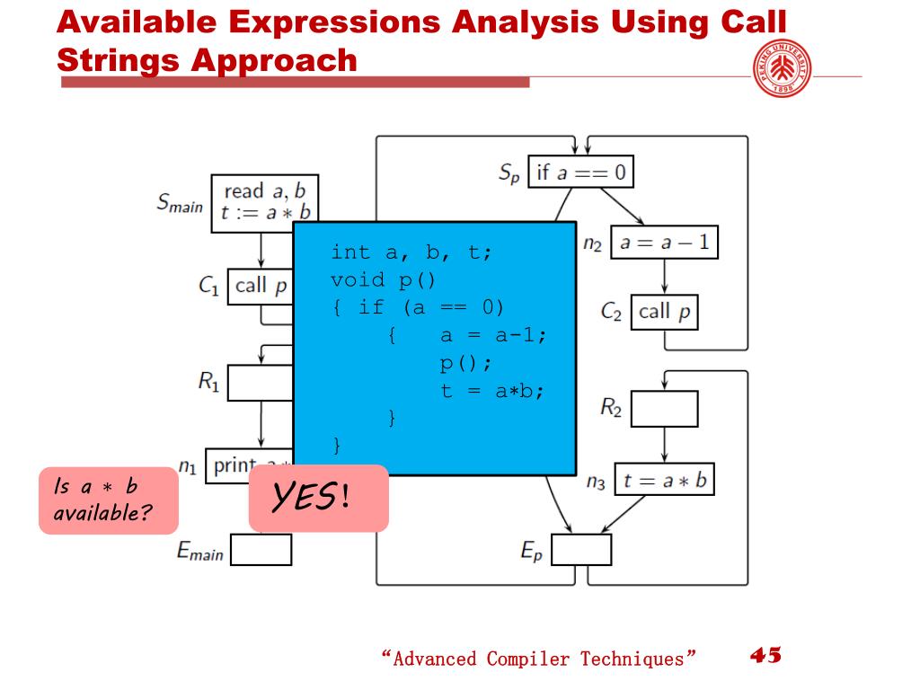 Available Expressions Analysis Using Call Strings Approach inta, b, t; void p() { if (a == 0) { a = a-1; p(); t = a∗b; } } YES! Is a ∗ b available? “Advanced Compiler Techniques”