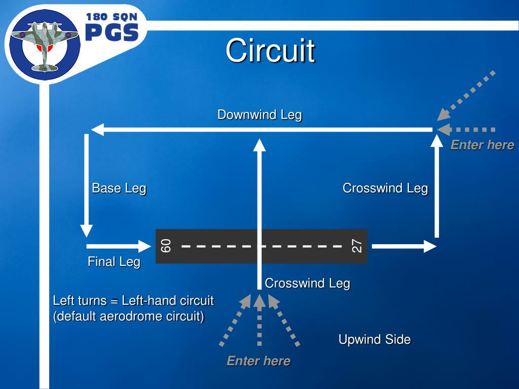 Circuit Downwind Leg Enter here Base Leg Crosswind Leg 09 27 Final Leg Crosswind Leg Left turns = Left-hand circuit(default aerodrome circuit) Upwind Side Enter here