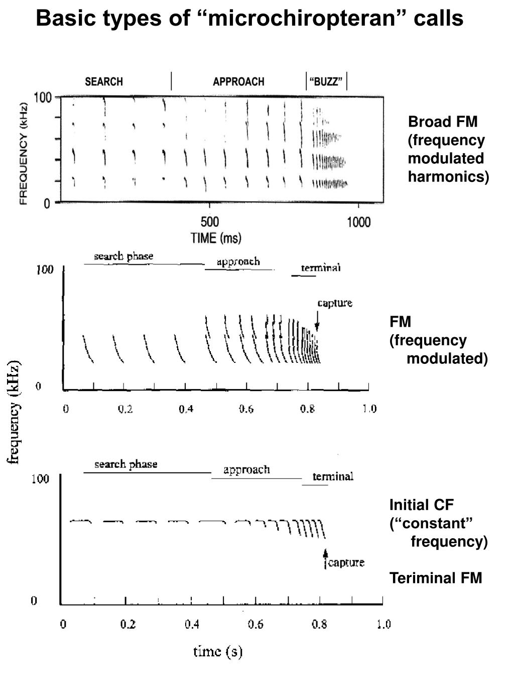 Basic types of “microchiropteran” calls Broad FM (frequency modulated harmonics) FM (frequency modulated) Initial CF (“constant” frequency) Teriminal FM