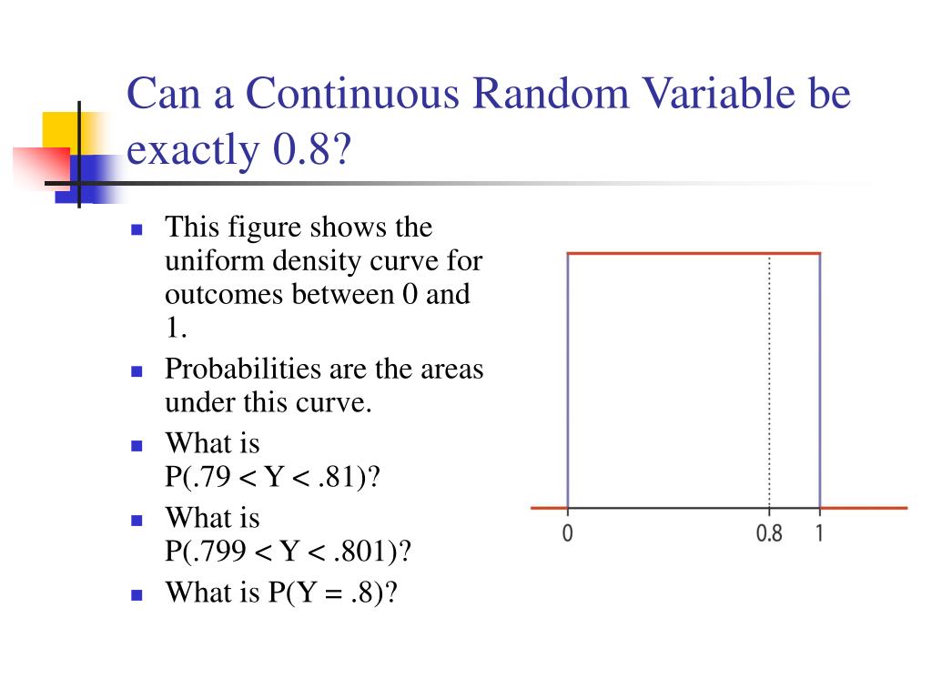 Can a Continuous Random Variable be exactly 0.8? • This figure shows the uniform density curve for outcomes between 0 and 1. • Probabilities are the areas under this curve. • What is P(.79 < Y < .81)? • What is P(.799 < Y < .801)? • What is P(Y = .8)?