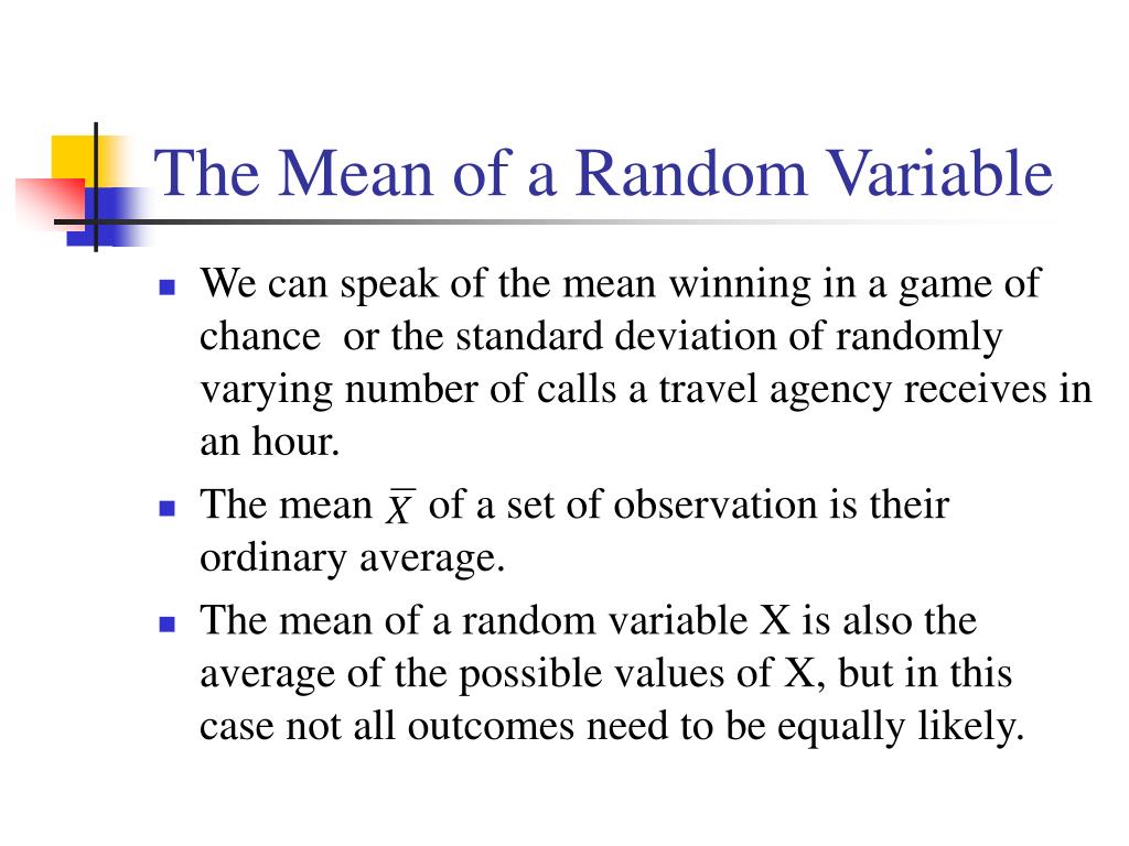 The Mean of a Random Variable • We can speak of the mean winning in a game of chance or the standard deviation of randomly varying number of calls a travel agency receives in an hour. • The mean of a set of observation is their ordinary average. • The mean of a random variable X is also the average of the possible values of X, but in this case not all outcomes need to be equally likely.