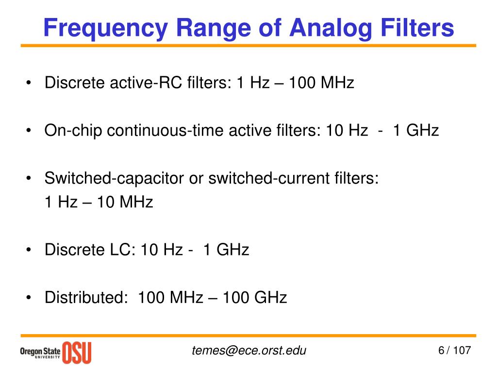 Frequency Range of Analog Filters • Discrete active-RC filters: 1 Hz – 100 MHz • On-chip continuous-time active filters: 10 Hz - 1 GHz • Switched-capacitor or switched-current filters: 1 Hz – 10 MHz • Discrete LC: 10 Hz - 1 GHz • Distributed: 100 MHz – 100 GHz