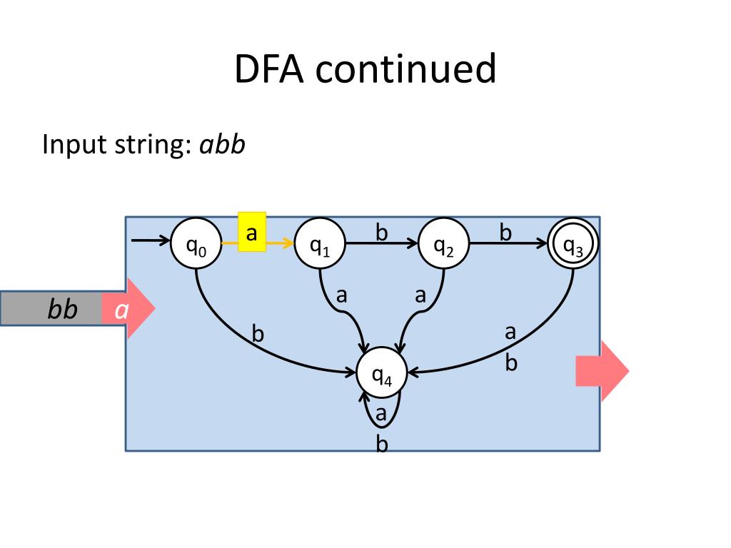 DFA continued Input string: abb a b b q0 q1 q2 q3 a a a b a b bb q4 a b