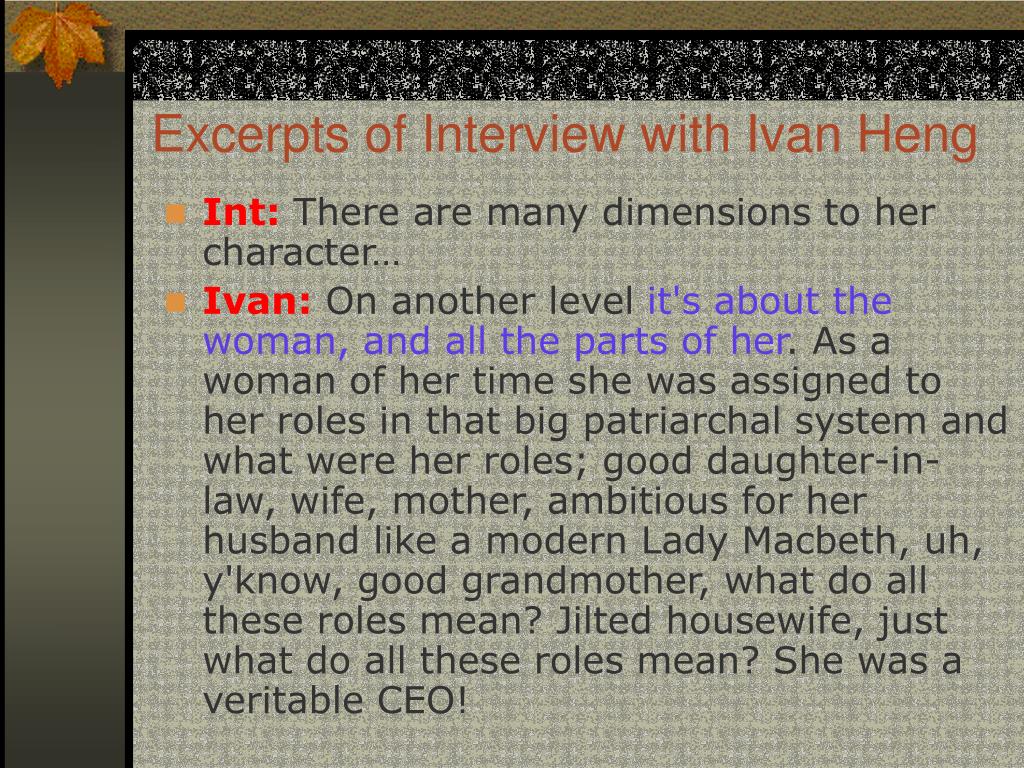 Excerpts of Interview with Ivan Heng • Int:Yes, I wanted to ask you about that. What sort of qualities do you think you being a man in a woman's role, has imparted to the character? Do you think it has given it a new edge or somehow made the character appear stronger?