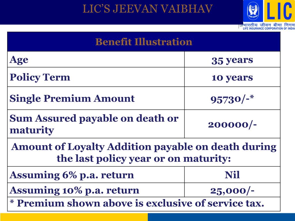 LIC’S JEEVAN VAIBHAVFeatures • Single Premium non-linked endowment assurance plan. • Maturity Benefit : Sum Assured and Loyalty Addition# • Liquidity : Facility for loan. • Life Cover : Full Sum Assured Payable on death during the term. • # Loyalty Addition, if any, payable on death during the last policy year or on maturity.