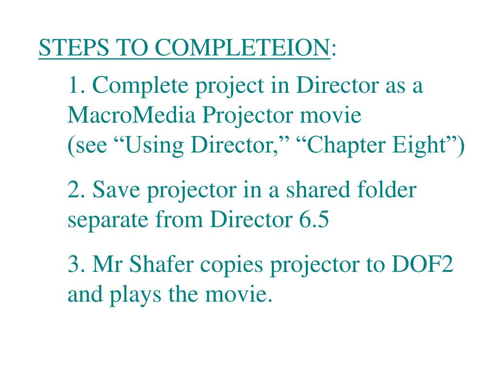 STEPS TO COMPLETEION: 1. Complete project in Director as a MacroMedia Projector movie (see “Using Director,” “Chapter Eight”) 2. Save projector in a shared folder separate from Director 6.5 3. Mr Shafer copies projector to DOF2 and plays the movie.