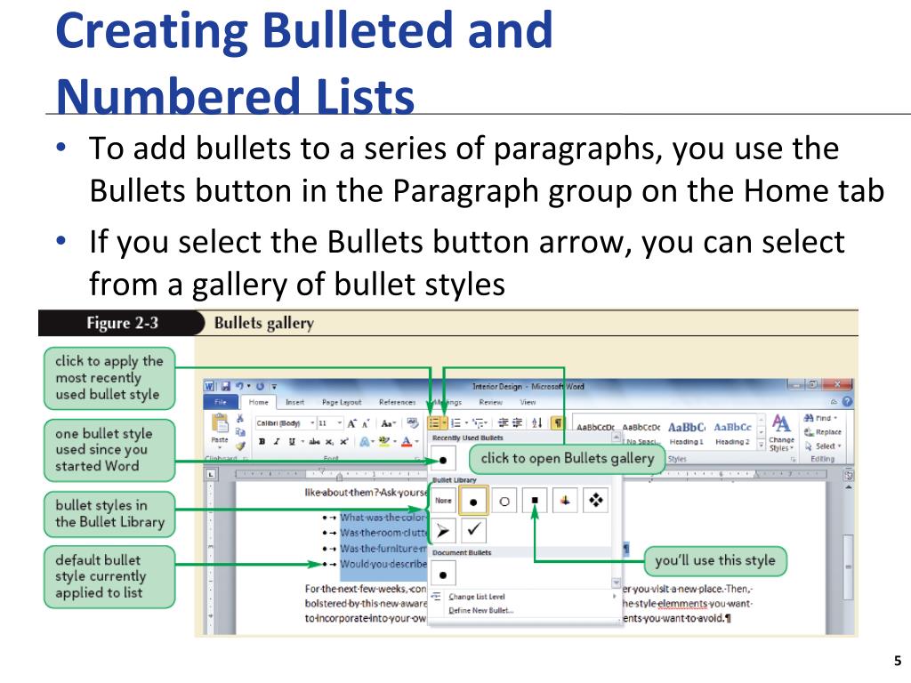 Creating Bulleted and Numbered Lists • To add bullets to a series of paragraphs, you use the Bullets button in the Paragraph group on the Home tab • If you select the Bullets button arrow, you can select from a gallery of bullet styles