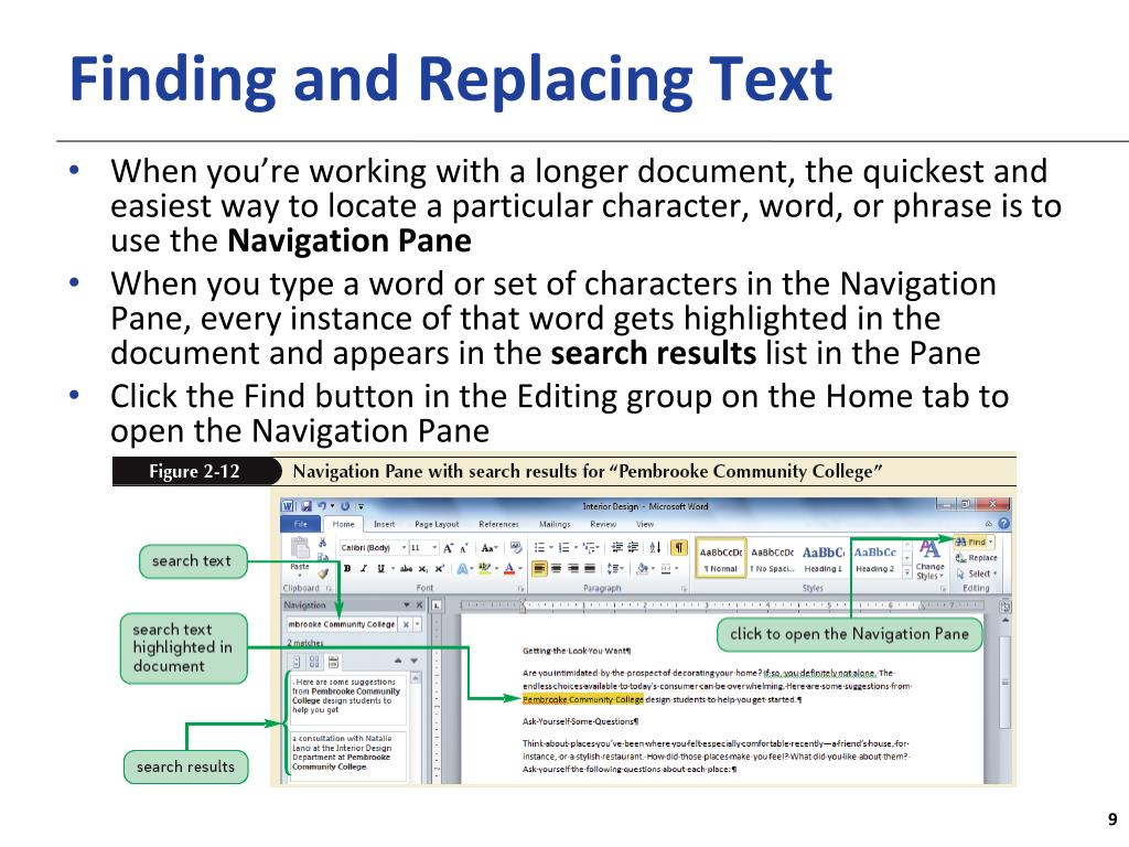 Finding and Replacing Text • When you’re working with a longer document, the quickest and easiest way to locate a particular character, word, or phrase is to use the Navigation Pane • When you type a word or set of characters in the Navigation Pane, every instance of that word gets highlighted in the document and appears in the search results list in the Pane • Click the Find button in the Editing group on the Home tab to open the Navigation Pane