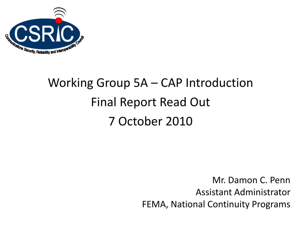 Working Group 5A – CAP Introduction Final Report Read Out 7 October 2010 Mr. Damon C. Penn Assistant Administrator FEMA, National Continuity Programs Communications Security, Reliability and Interoperability Council CSR C