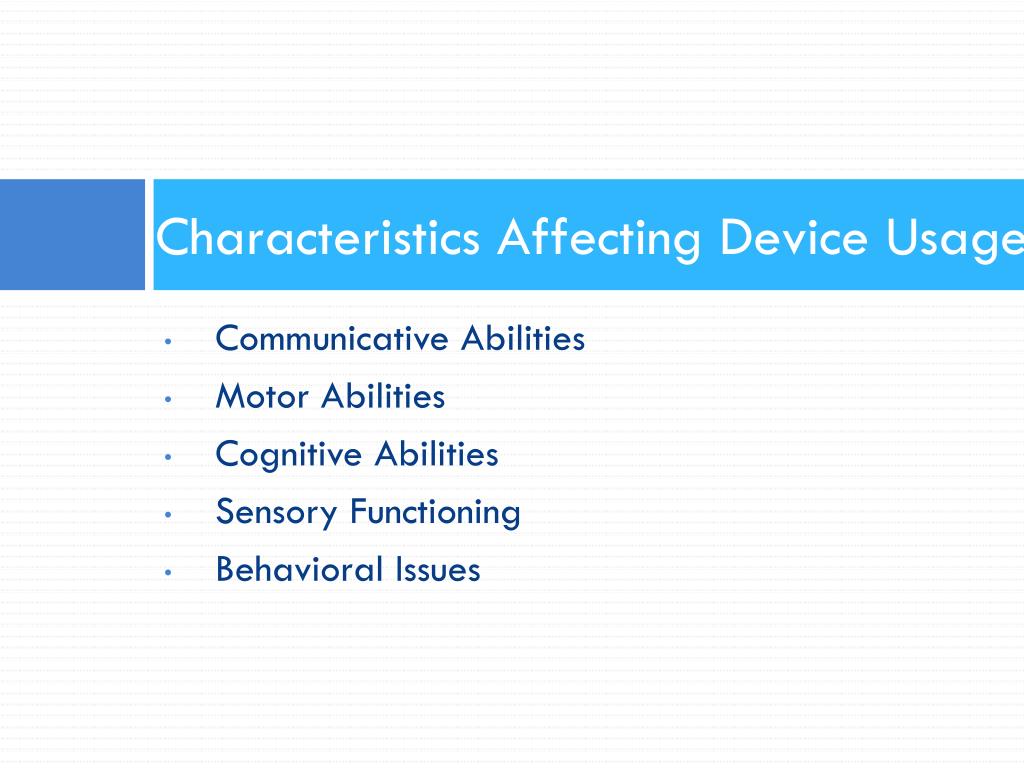 Characteristics Affecting Device Usage Communicative Abilities Motor Abilities Cognitive Abilities Sensory Functioning Behavioral Issues