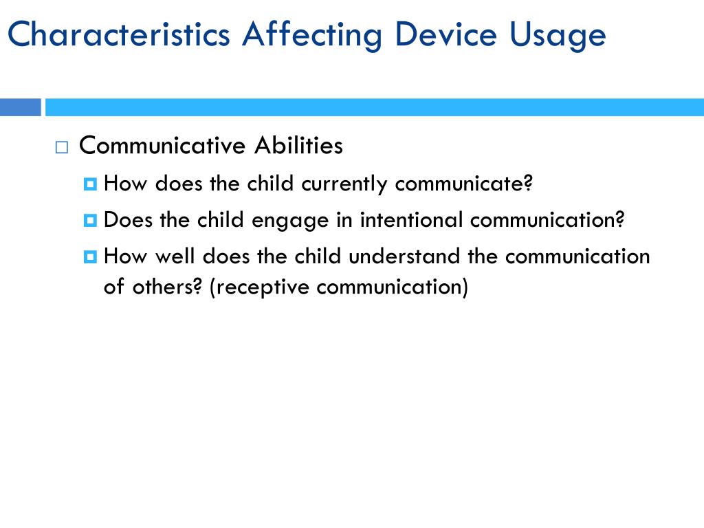 Characteristics Affecting Device Usage • Communicative Abilities • How does the child currently communicate? • Does the child engage in intentional communication? • How well does the child understand the communication of others? (receptive communication)