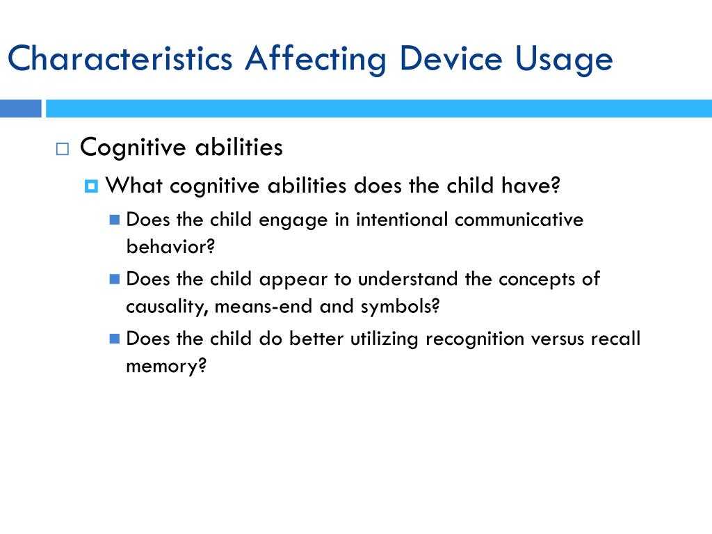 Characteristics Affecting Device Usage • Cognitive abilities • What cognitive abilities does the child have? • Does the child engage in intentional communicative behavior? • Does the child appear to understand the concepts of causality, means-end and symbols? • Does the child do better utilizing recognition versus recall memory?